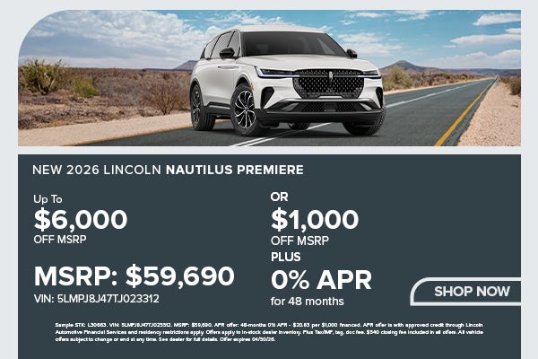 Sample STK: L30663. VIN: 5LMPJ8J47TJ023312. MSRP: $59,690. APR offer: 48-months 0% APR - $20.83 per $1,000 financed. APR offer is with approved credit through Lincoln Automotive Financial Services and residency restrictions apply. Offers apply to in-stock dealer inventory. Plus Tax/IMF, tag, doc fee. $540 closing fee included in all offers. All vehicle offers subject to change or end at any time. See dealer for full details. Offer expires 04/30/26.