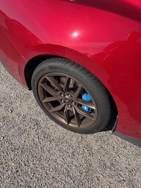 The exterior of this Mustang is dressed in a stunning Rapid Red Metallic Tinted Clearcoat, complemented by the Bronze Appearance Package and its unique badging. The 19-inch branded brake system with performance linings ensures confident stopping power, while the Grabber Blue brake calipers with white logo add a touch of style.