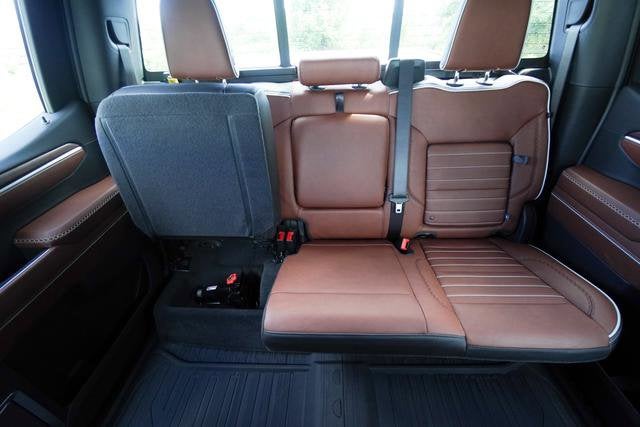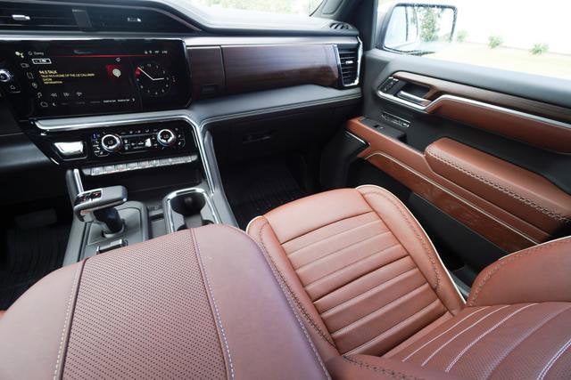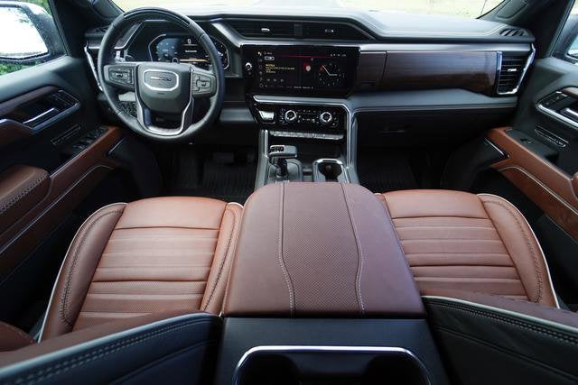 The Sierra Denali Ultimate's interior is a sanctuary of refined comfort and advanced technology. Sink into the heated and ventilated front seats, surrounded by genuine wood accents and premium leather upholstery. The 15-inch diagonal head-up display and wireless charging capabilities seamlessly integrate your digital life, while the Bose premium audio system and SiriusXM with 360L provide an unparalleled listening experience.